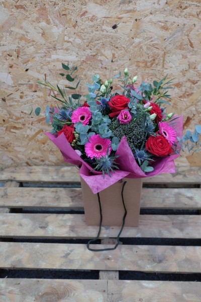 Please note we have have sold out of red roses so your bouquet designed with a beautiful array of red blooms & cerise pink roses.