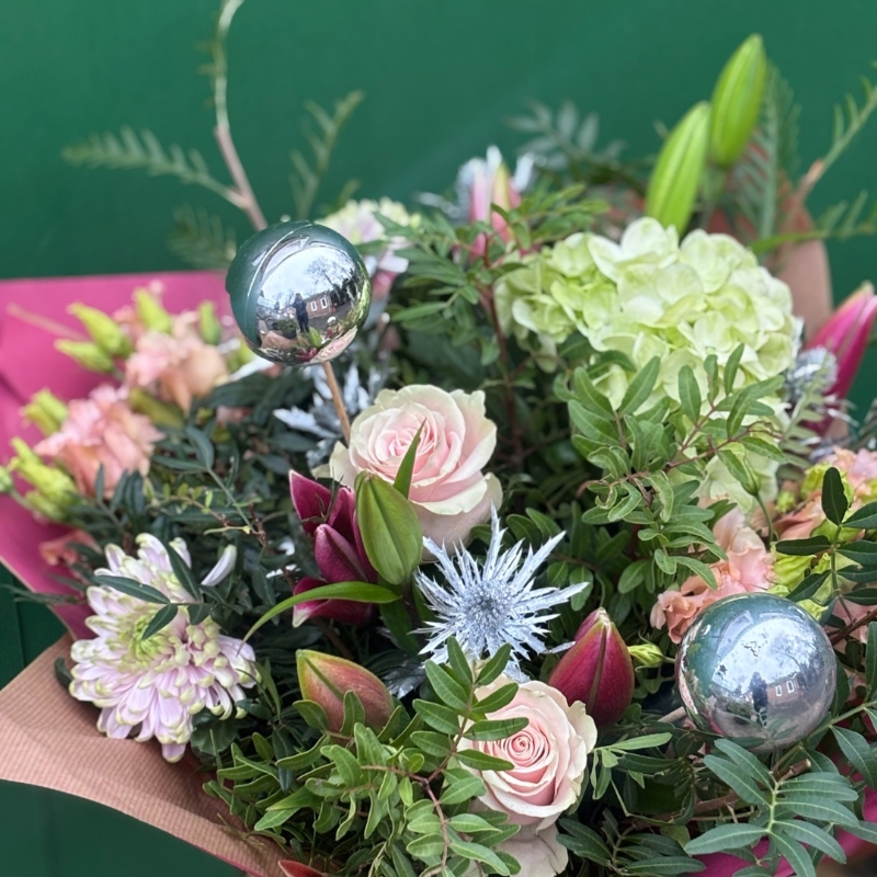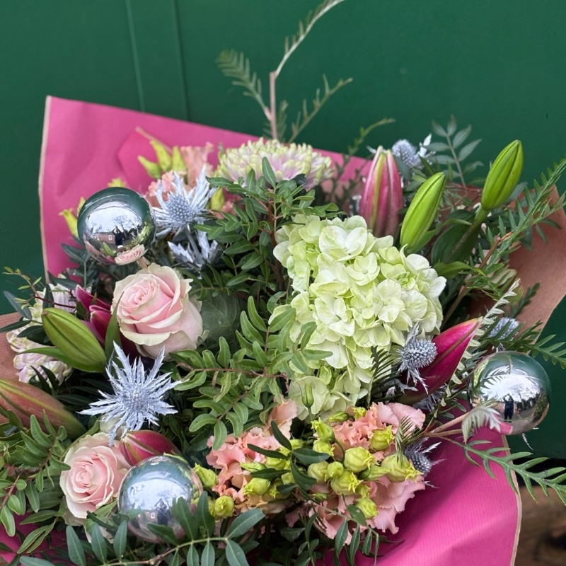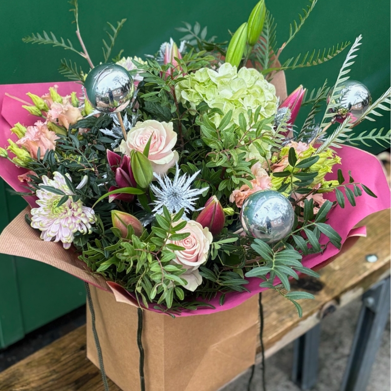 A twist to your usual Red Rudolf: Blushing pinks and silvery whites arranged perfectly in a handtied bouquet.