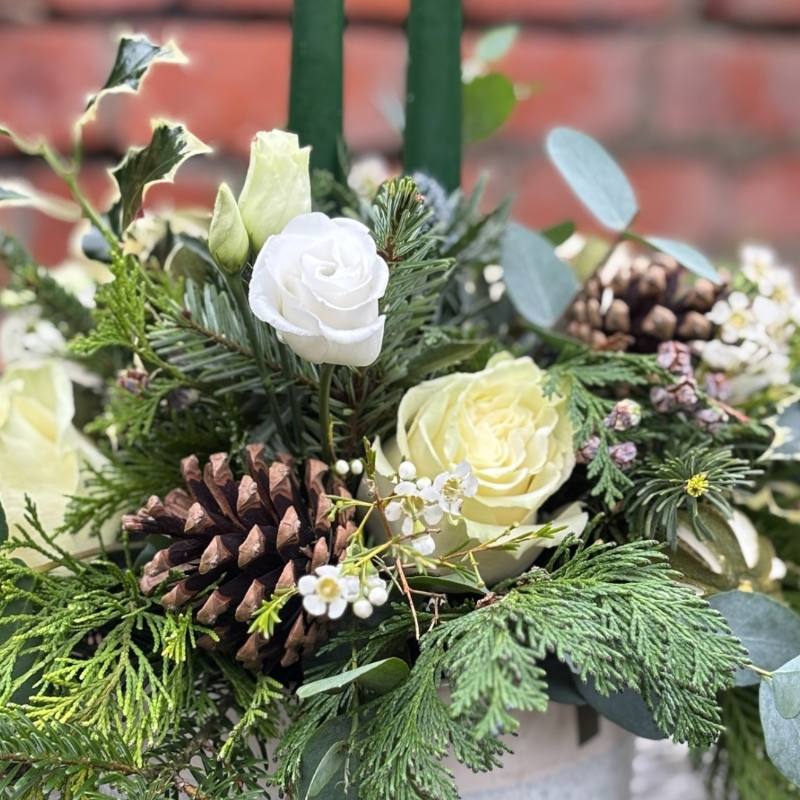 Twelfth Night is a serene Christmas table arrangement filled with scented pine ivory roses cones waxflower and winter foliage for a calm elegant festive feel.