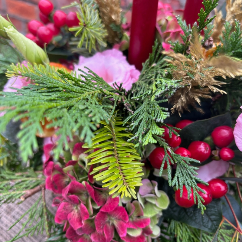 Mulberry Blush is a rich Christmas table arrangement filled with scented pine berries roses and dried fruits creating a warm luxurious festive feel.