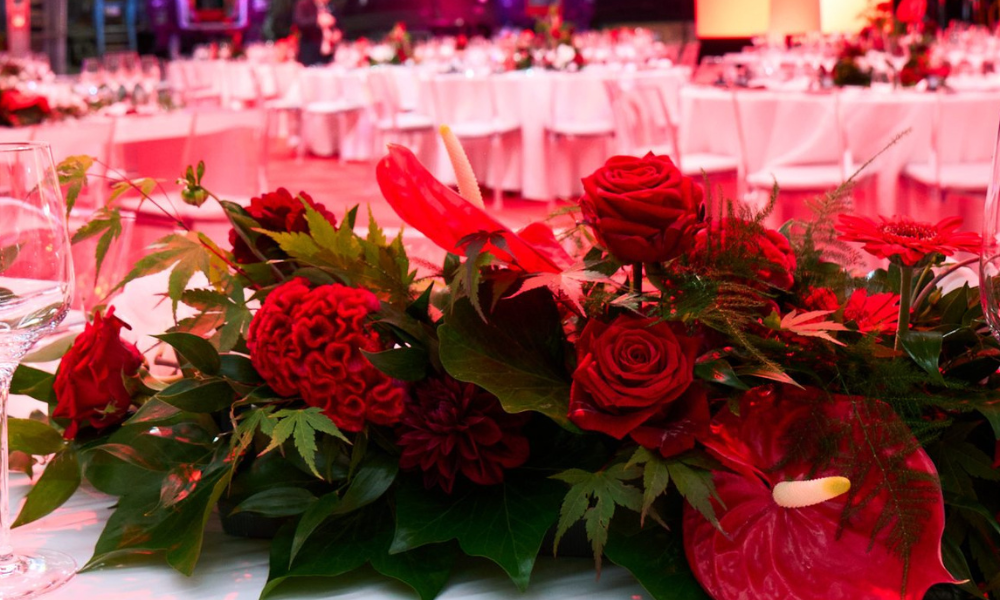 We bended a mix of English and Japanese inspiration and flowers to make table centres that created a wow factor while allowing guests to see the stage clearly throughout the evening.